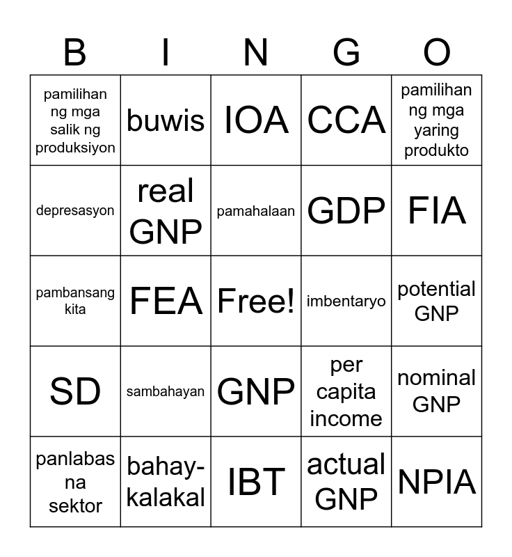 This bingo card has a free space and 24 words: sambahayan, bahay-kalakal, pamahalaan, panlabas na sektor, pamilihan ng mga yaring produkto, pamilihan ng mga salik ng produksiyon, depresasyon, buwis, imbentaryo, GNP, GDP, pambansang kita, per capita income, nominal GNP, real GNP, actual GNP, potential GNP, IOA, FIA, FEA, NPIA, SD, CCA and IBT.