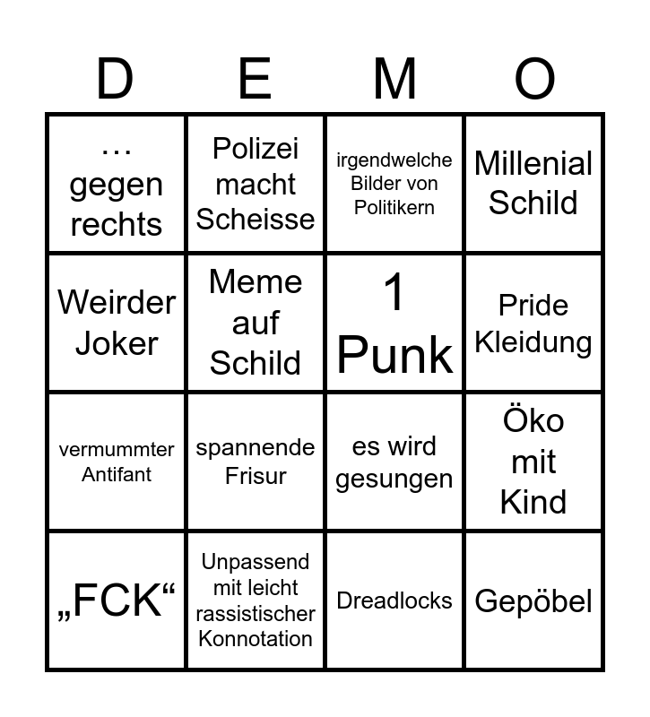 This bingo card has 16 words: Unpassend mit leicht rassistischer Konnotation, Öko mit Kind, irgendwelche Bilder von Politikern, … gegen rechts, vermummter Antifant, Polizei macht Scheisse, es wird gesungen, Dreadlocks, Weirder Joker, Meme auf Schild, „FCK“, Millenial Schild, spannende Frisur, Pride Kleidung, 1 Punk and Gepöbel.
