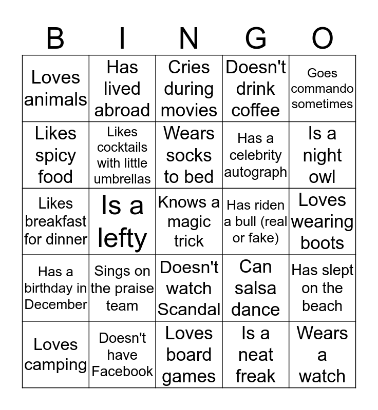 This bingo card has 25 words: Sings on the praise team, Loves board games, Wears socks to bed, Loves camping, Goes commando sometimes, Loves animals, Likes spicy food, Has lived abroad, Has riden a bull (real or fake), Doesn't watch Scandal, Has a celebrity autograph, Likes breakfast for dinner, Can salsa dance, Has slept on the beach, Likes cocktails with little umbrellas, Wears a watch, Loves wearing boots, Cries during movies, Is a night owl, Is a lefty, Knows a magic trick, Doesn't have Facebook, Has a birthday in December, Doesn't drink coffee and Is a neat freak.