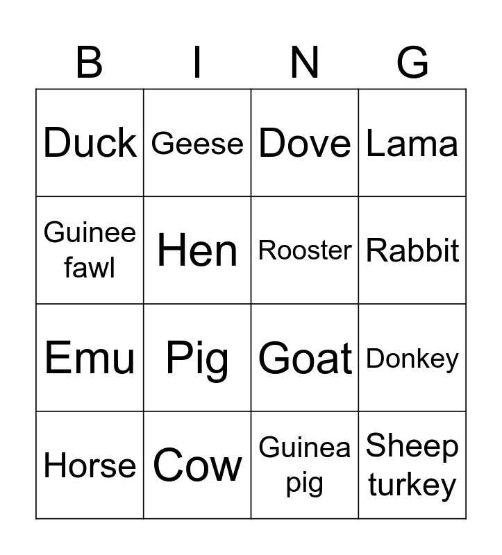 This bingo card has 16 words: Cow, Donkey, Dove, Duck, Emu, Geese, Goat, Guinea pig, Guinee fawl, Hen, Horse, Lama, Pig, Rabbit, Rooster and Sheep turkey.