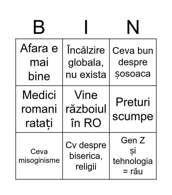 This bingo card has a free space and 8 words: Preturi scumpe, Ceva bun despre șosoaca, Încălzire globala, nu exista, Ceva misoginisme, Afara e mai bine, Gen Z și tehnologia = rău, Medici romani ratați and Cv despre biserica, religii.