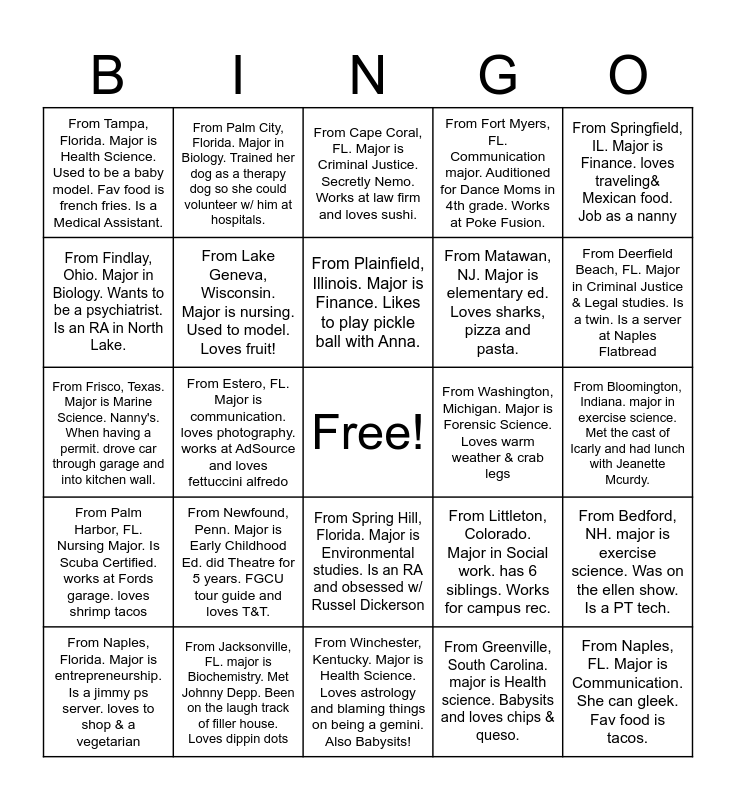 This bingo card has a free space and 25 words: From Newfound, Penn. Major is Early Childhood Ed. did Theatre for 5 years. FGCU tour guide and loves T&T., From Winchester, Kentucky. Major is Health Science. Loves astrology and blaming things on being a gemini. Also Babysits!, From Plainfield, Illinois. Major is Finance. Likes to play pickle ball with Anna., From Naples, Florida. Major is entrepreneurship. Is a jimmy ps server. loves to shop & a vegetarian, From Springfield, IL. Major is Finance. loves traveling& Mexican food. Job as a nanny, From Tampa, Florida. Major is Health Science. Used to be a baby model. Fav food is french fries. Is a Medical Assistant., From Findlay, Ohio. Major in Biology. Wants to be a psychiatrist. Is an RA in North Lake., From Palm City, Florida. Major in Biology. Trained her dog as a therapy dog so she could volunteer w/ him at hospitals., From Washington, Michigan. Major is Forensic Science. Loves warm weather & crab legs, From Spring Hill, Florida. Major is Environmental studies. Is an RA and obsessed w/ Russel Dickerson, From Matawan, NJ. Major is elementary ed. Loves sharks, pizza and pasta., From Frisco, Texas. Major is Marine Science. Nanny's. When having a permit. drove car through garage and into kitchen wall., From Littleton, Colorado. Major in Social work. has 6 siblings. Works for campus rec., From Bedford, NH. major is exercise science. Was on the ellen show. Is a PT tech., From Lake Geneva, Wisconsin. Major is nursing. Used to model. Loves fruit!, From Madison, Wisconsin. Major in Business management. works at cycle bar. Loves trying new coffee shops., From Bloomington, Indiana. major in exercise science. Met the cast of Icarly and had lunch with Jeanette Mcurdy., From Cape Coral, FL. Major is Criminal Justice. Secretly Nemo. Works at law firm and loves sushi., From Deerfield Beach, FL. Major in Criminal Justice & Legal studies. Is a twin. Is a server at Naples Flatbread, From Estero, FL. Major is communication. loves photography. works at AdSource and loves fettuccini alfredo, From Naples, FL. Major is Communication. She can gleek. Fav food is tacos., From Jacksonville, FL. major is Biochemistry. Met Johnny Depp. Been on the laugh track of filler house. Loves dippin dots, From Palm Harbor, FL. Nursing Major. Is Scuba Certified. works at Fords garage. loves shrimp tacos, From Fort Myers, FL. Communication major. Auditioned for Dance Moms in 4th grade. Works at Poke Fusion. and From Greenville, South Carolina. major is Health science. Babysits and loves chips & queso..