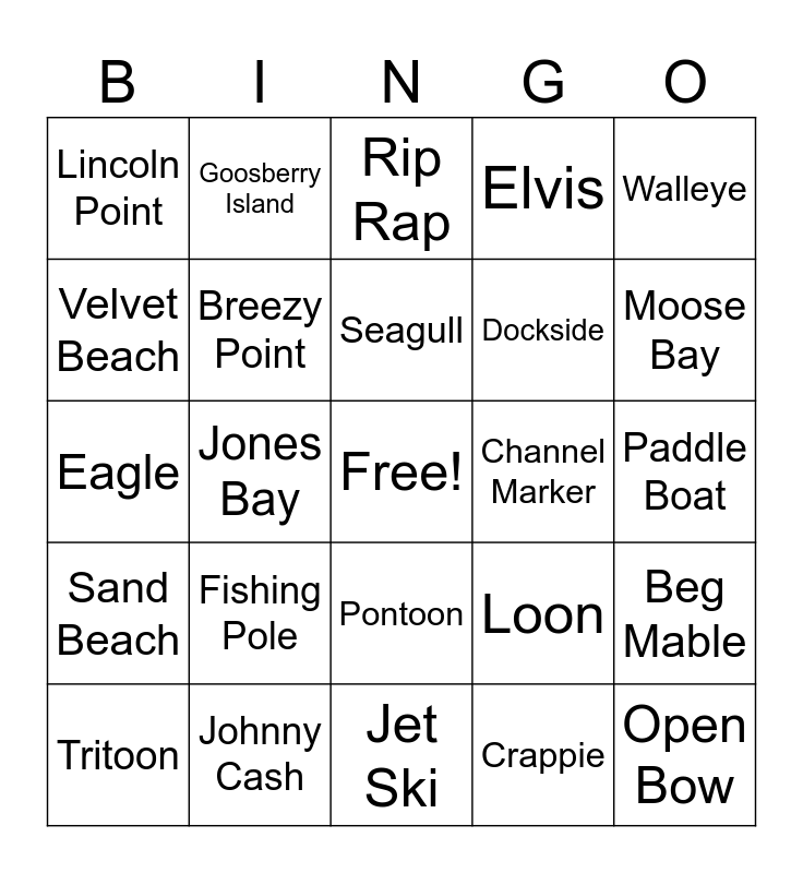 This bingo card has a free space and 24 words: Fishing Pole, Johnny Cash, Seagull, Tritoon, Walleye, Lincoln Point, Velvet Beach, Goosberry Island, Channel Marker, Pontoon, Dockside, Eagle, Loon, Beg Mable, Breezy Point, Crappie, Paddle Boat, Rip Rap, Moose Bay, Jones Bay, Open Bow, Sand Beach, Elvis and Jet Ski.