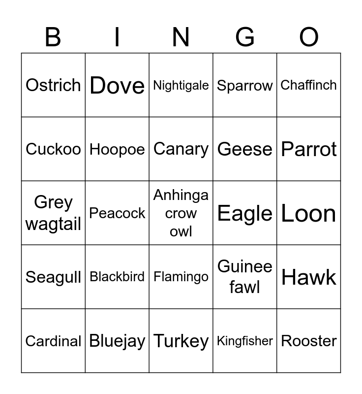 This bingo card has a free space and 24 words: Blackbird, Bluejay, Canary, Cardinal, Chaffinch, Ostrich, Cuckoo, Dove, Eagle, Flamingo, Geese, Grey wagtail, Guinee fawl, Hawk, Hoopoe, Kingfisher, Loon, Nightigale, Parrot, Peacock, Rooster, Seagull, Sparrow and Turkey.