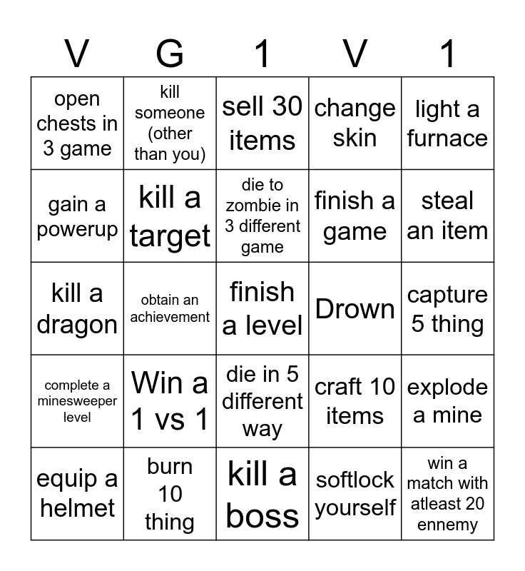 This bingo card has 25 words: Win a 1 vs 1, kill a boss, die to zombie in 3 different game, equip a helmet, light a furnace, open chests in 3 game, gain a powerup, kill someone (other than you), Drown, die in 5 different way, finish a game, kill a dragon, craft 10 items, explode a mine, kill a target, win a match with atleast 20 ennemy, capture 5 thing, sell 30 items, steal an item, obtain an achievement, finish a level, burn 10 thing, complete a minesweeper level, change skin and softlock yourself.