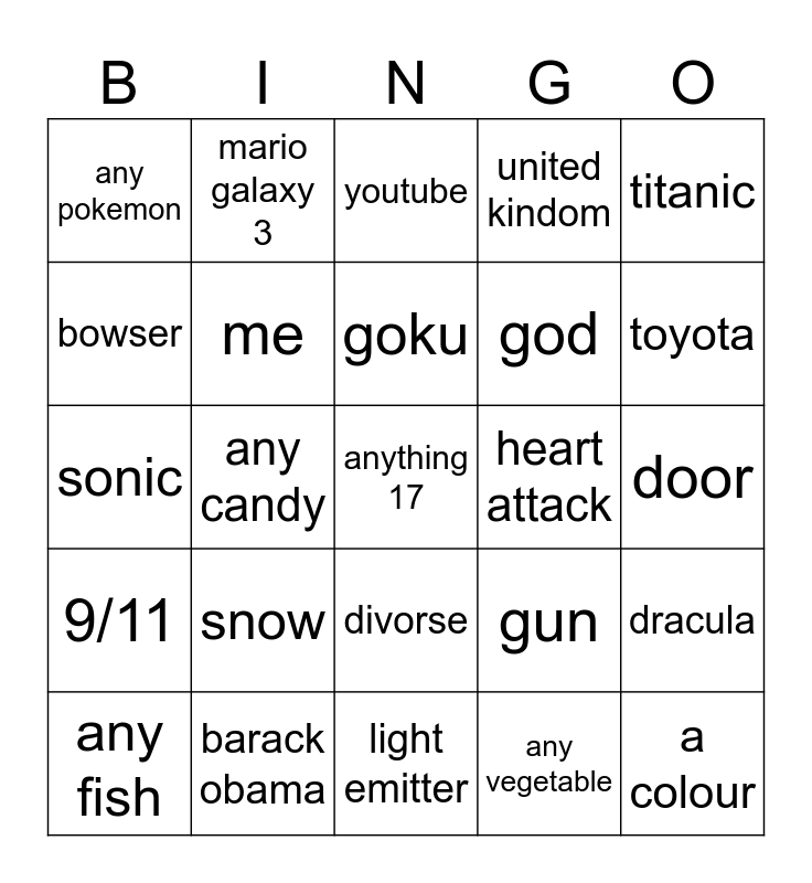 This bingo card has 25 words: snow, light emitter, goku, any fish, titanic, any pokemon, bowser, mario galaxy 3, heart attack, divorse, god, sonic, gun, dracula, me, a colour, door, youtube, toyota, any candy, anything 17, barack obama, 9/11, united kindom and any vegetable.