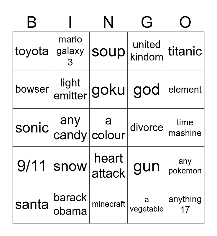 This bingo card has 25 words: snow, minecraft, goku, santa, titanic, toyota, bowser, mario galaxy 3, divorce, heart attack, god, sonic, gun, any pokemon, light emitter, anything 17, time mashine, soup, element, any candy, a colour, barack obama, 9/11, united kindom and a vegetable.