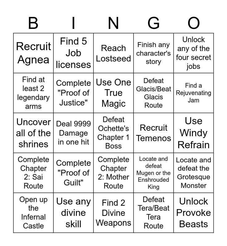 This bingo card has a free space and 49 words: Find at least 1 piece of Battle-Tested Equipment, Unlock Provoke Beasts, Locate and defeat Harvey, Find 2 Divine Weapons, Complete "Proof of Guilt", Unlock "Deal More Damage", Find 5 Job licenses, Recruit Castti, Find at least 2 legendary arms, Unlock 4 Travelers, Complete "Proof of Justice", Finish any character's story, Locate and defeat the Grotesque Monster, Locate and defeat Mugen or the Enshrouded King, Defeat either of the Darklings of the Sorrowful Moon, Unlock any EX Skill, Use One True Magic, Recruit Temenos, Unlock 3 unique subjobs, Unlock any of the four secret jobs, Deal 9999 Damage in one hit, Defeat Tera/Beat Tera Route, Recruit Agnea, Defeat Glacis/Beat Glacis Route, Locate and defeat Heavenwing, Find a Rejuvenating Jam, Open up the Infernal Castle, Complete "Procur Peculiar Tomes"", Complete Chapter 2: Mother Route, Complete Chapter 2: Sai Route, Locate and defeat Vados, the Architect, Unlock "Boost Start", Unlock "Full Power", Complete Chapter 3: Stormhail Route, Use any divine skill, Unlock "Peak Performance", Defeat the threat in the mines, Find an Ancient Cursed Talisman, Use Windy Refrain, Complete "The Hunter and the Apothecary 1", Unlock the Jukebox, Defeat Yuras, Learn "Limb from Limb", Reach Stormhail, Uncover all of the shrines, Reach Lostseed, Locate and defeat Behemoth, Find Alpione's Amulet, Finisher's Claws, Fang of Ferocity or Stone of Truth and Complete Agnea's Chapter 2.