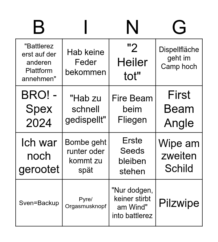 This bingo card has 16 words: Pyre/ Orgasmusknopf, Wipe am zweiten Schild, "2 Heiler tot", "Battlerez erst auf der anderen Plattform annehmen", Ich war noch gerootet, Hab keine Feder bekommen, Erste Seeds bleiben stehen, "Nur dodgen, keiner stirbt am Wind" into battlerez, BRO! - Spex 2024, "Hab zu schnell gedispellt", Sven=Backup, Dispellfläche geht im Camp hoch, Bombe geht runter oder kommt zu spät, First Beam Angle, Fire Beam beim Fliegen and Pilzwipe.