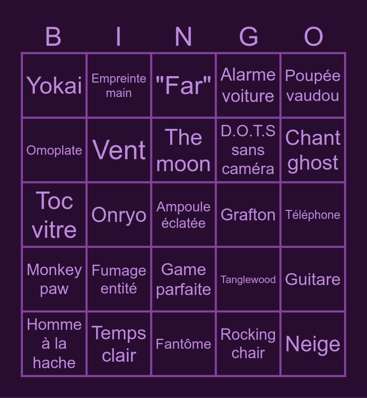 This bingo card has 137 words: Banshee, Cauchemar, Démon, Deogen, Djinn, Esprit, Fantôme, Goryo, Hantu, Mimic, Jumeaux, Moroï, Myling, Obake, Ombre, Oni, Onryo, Poltergeist, Raiju, Revenant, Spectre, Thayé, Yokai, Yurei, Tarot, Poupée vaudou, Boîte à musique, Miroir, Cercle, Ouija, Monkey paw, Temps clair, Pluie, Neige, Brouillard, Orage, Grande prêtresse, Pendu, The death, The sun, The moon, Crâne, Cage thoracique, Colonne vertébrale, Bassin, Main, Pied, Toc vitre, Empreinte main, Empreinte vitre, Empreinte interrupteur, D.O.T.S sans caméra, -25% santé mentale, Sadako, Enfant, Homme tout nu, Boucher, Femme nuisette, Homme à la batte, Homme à la hache, Vieille, Eau sale, Allume douche, Allume lumière, Lumière rouge, Ampoule éclatée, Écriture, Résurrection, Température, EMF5, Disjoncteur, Game parfaite, Tanglewood, Willow, Ridgeview, Edgefield, Vent, Grafton, Camp, "Far", Capteur mouvement, "Behind", Cache cache, Loop sans se cacher, Game -10 min, Crucifix 100%, Téléphone, Rire ghost, Game -20min, Game sans mort, Piano, Guitare, TP peluche, TP mannequin, Alarme voiture, Ghost allume TV, Ghost allume radio, Ghost allume ordinateur, Rocking chair, Ballon, Empreinte pied, Toc glacière, Mist, Marche sel, Omoplate, Apparition pleine, Apparition ombre, Chasse maudite, Fémur, Empreinte glacière, Décès, Cri banshee, Souffle Deogen, Chant ghost, Spiritbox, Bougie soufflée, Os de merde, Soleil levant, Fumage entité, 0% santé mentale, Ghost rampant, Empreinte clavier, Ghost photo, The fool, Wheel of fortune green, Wheel of fortune red, Dos cassé, The hermit, Homme faucille, The devil, Livre qui vole, Éteint lumière, Orbe, Micro parabolique, Empreinte disjoncteur, Porte disjoncteur and EMF4.