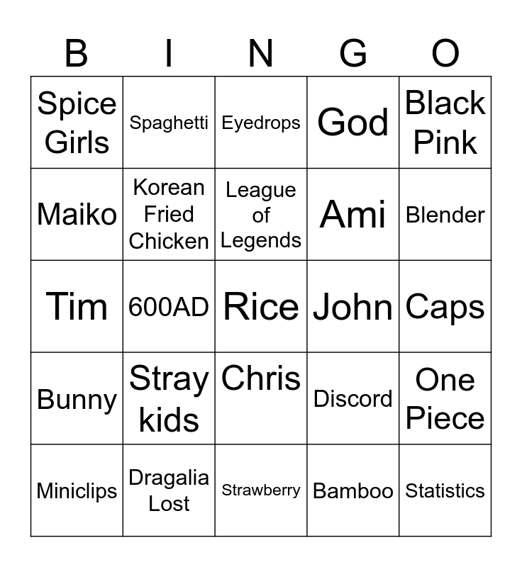 This bingo card has a free space and 24 words: Stray kids, Dragalia Lost, League of Legends, Miniclips, Black Pink, Spice Girls, Maiko, Spaghetti, John, Chris, Ami, Tim, Discord, One Piece, Korean Fried Chicken, Bamboo, Caps, Eyedrops, Blender, 600AD, Statistics, Bunny, God and Strawberry.