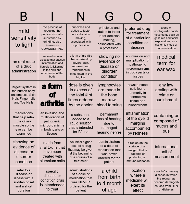 This bingo card has 36 words: medications that help relax the ciliary muscle so the eye can be examined, an invasion and multiplication of pathogenic microorganisms in body parts or tissues, administrations of a dose of medication that was NEVER ordered for the patient, showing no evidence of disease or disorder condition, a white blood cell, found primarily in connective tissue and bloodstream, any law dealing with crime or punishment, mild sensitivity to light, specific disease or condition drug is intendended to treat, principles and duties to factor in for decision making, associated with a profession, administrators of a dose of medication that was never ordered for the patient, an invasion and multiplication of pathogenic microorganisms in body parts or tissues, study of nonlinguistic bodily movements such as gestures and facial expressions, as a systemic mode of communication, showing no evidence of disease or disorder condition, a form of arthritis, a form of arthritis characterized by severe pain, redness, and tenderness in joints often in the big toe, principles and duties to factor in for decision making, associated with a profession, a region on the surface of an antigen that is capable of producing an immune response, containing or composed of mucus and pus, an oral route of a drug administration, an autoimmune disease that causes inflammation and fibrosis (thickening) in the skin and other areas of the body, a substance added to a liquid solution that is intended for IV use, permanent loss of hearing due to damaged hearing nerves, inflammation of the eyelid margins accompanied by redness, international unit of measurement, largest system in the human body, encompass: Skin, Hair, Fingernails and Toe Nails, the process of reducing the particle size of a substance by grinding, also known as COMMUNITING, dose is given in excess of the total # of times ordered by the doctor, a child from birth to 1 month of age, preferred drug for treatment of a particular condition or disease, medical term for ear wax, refer to a disease or illness with a sudden onset and a short duration, made from viral toxins that have been treated with alumnium salts, An initial higher dose of a drug that may be given at the beginning of a course of a treatment, lymphocytes are made in the bone marrow, blood forming, location where a medicine will exert its effect and a noninflammatory disease in which the retina has become damaged- causes from HTN or diabetes.