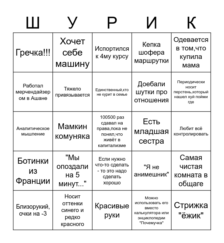 This bingo card has 25 words: "Мы опоздали на 5 минут...", Красивые руки, Единственный,кто не курит в семье, Близорукий, очки на -3, Одевается в том,что купила мама, Гречка!!!, Работал мерчендайзер ом в Ашане, Хочет себе машину, Есть младшая сестра, Если нужно что-то сделать - то это надо сделать хорошо, Доебали шутки про отношения, Аналитическое мышление, "Я не анимешник", Самая чистая комната в общаге, Тяжело привязывается, Стрижка "ёжик", Любит всё контролировать, Испортился к 4му курсу, Периодически носит перстень,который нашел хуй пойми где, Мамкин комуняка, 100500 раз сдавал на права,пока не понял,что живёт в капитализме, Носит оттенки синего и редко красного, Ботинки из Франции, Кепка шофера маршрутки and Можно использовать его вместо калькулятора или энциклопедии "Почемучка".