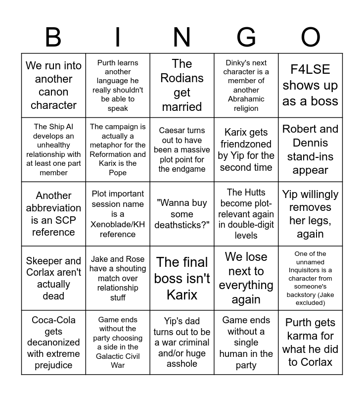 This bingo card has a free space and 24 words: Jake and Rose have a shouting match over relationship stuff, Game ends without the party choosing a side in the Galactic Civil War, Caesar turns out to have been a massive plot point for the endgame, Coca-Cola gets decanonized with extreme prejudice, F4LSE shows up as a boss, We run into another canon character, The Ship AI develops an unhealthy relationship with at least one part member, Purth learns another language he really shouldn't be able to speak, The Hutts become plot-relevant again in double-digit levels, The final boss isn't Karix, Karix gets friendzoned by Yip for the second time, Another abbreviation is an SCP reference, We lose next to everything again, One of the unnamed Inquisitors is a character from someone's backstory (Jake excluded), The campaign is actually a metaphor for the Reformation and Karix is the Pope, Game ends without a single human in the party, Yip willingly removes her legs, again, The Rodians get married, Robert and Dennis stand-ins appear, Plot important session name is a Xenoblade/KH reference, Purth gets karma for what he did to Corlax, Skeeper and Corlax aren't actually dead, Dinky's next character is a member of another Abrahamic religion and Yip's dad turns out to be a war criminal and/or huge asshole.