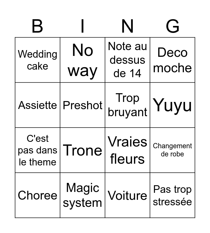 This bingo card has 16 words: Magic system, Changement de robe, Note au dessus de 14, Wedding cake, C'est pas dans le theme, No way, Vraies fleurs, Voiture, Assiette, Preshot, Choree, Deco moche, Trone, Yuyu, Trop bruyant and Pas trop stressée.