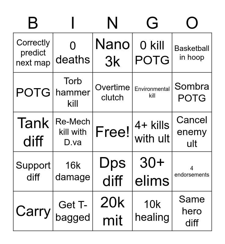 This bingo card has a free space and 24 words: 16k damage, Get T-bagged, Overtime clutch, Carry, Basketball in hoop, Correctly predict next map, POTG, 0 deaths, 4+ kills with ult, Dps diff, Environmental kill, Tank diff, 30+ elims, 4 endorsements, Torb hammer kill, 10k healing, Cancel enemy ult, Nano 3k, Sombra POTG, Re-Mech kill with D.va, Same hero diff, Support diff, 0 kill POTG and 20k mit.