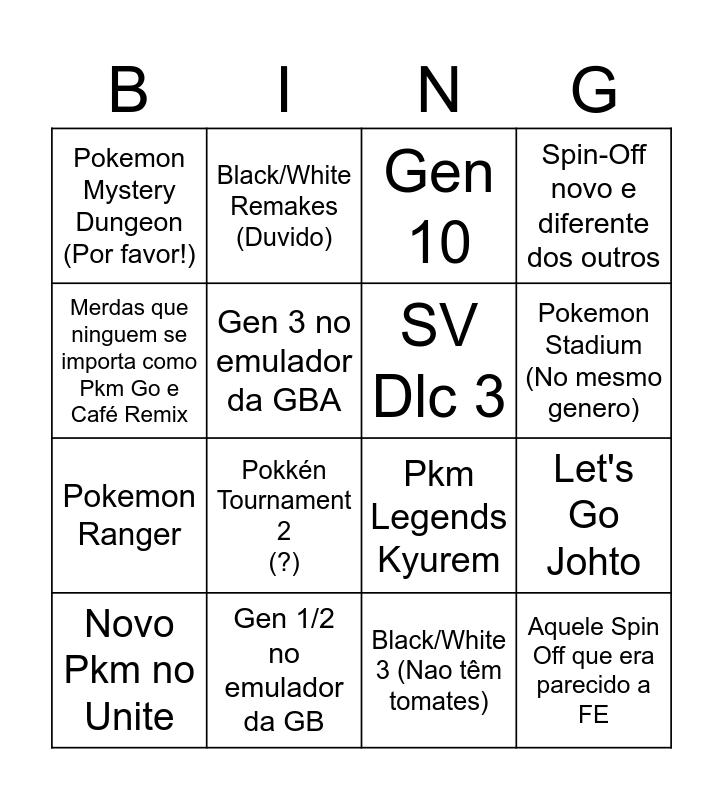 This bingo card has 16 words: Gen 1/2 no emulador da GB, Let's Go Johto, Gen 10, Pokemon Mystery Dungeon (Por favor!), Pokemon Ranger, Black/White Remakes (Duvido), Pkm Legends Kyurem, Black/White 3 (Nao têm tomates), Merdas que ninguem se importa como Pkm Go e Café Remix, Gen 3 no emulador da GBA, Novo Pkm no Unite, Spin-Off novo e diferente dos outros, Pokkén Tournament 2 (?), Pokemon Stadium (No mesmo genero), SV Dlc 3 and Aquele Spin Off que era parecido a FE.