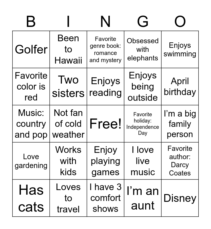 This bingo card has a free space and 24 words: Works with kids, Loves to travel, Enjoys reading, Has cats, Enjoys swimming, Golfer, Favorite color is red, Been to Hawaii, Favorite holiday: Independence Day, Enjoy playing games, Enjoys being outside, Music: country and pop, I love live music, Favorite author: Darcy Coates, Two sisters, I’m an aunt, I’m a big family person, Favorite genre book: romance and mystery, April birthday, Not fan of cold weather, Disney, Love gardening, Obsessed with elephants and I have 3 comfort shows.
