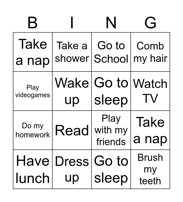 This bingo card has 16 words: Dress up, Take a nap, Go to School, Take a nap, Do my homework, Take a shower, Play with my friends, Go to sleep, Play videogames, Wake up, Have lunch, Comb my hair, Read, Watch TV, Go to sleep and Brush my teeth.