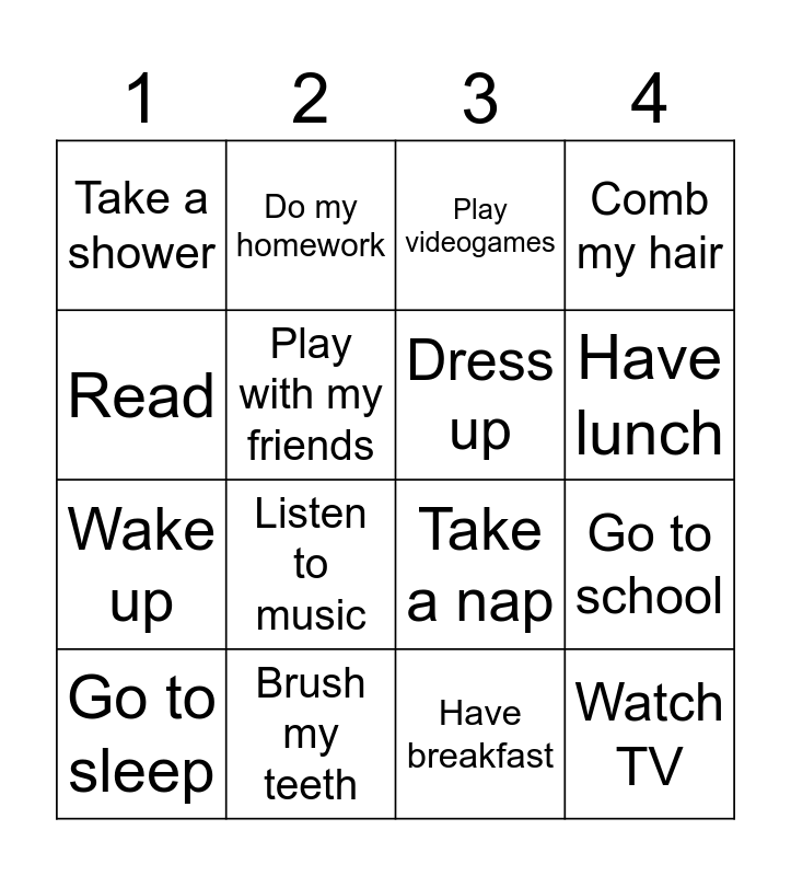 This bingo card has 16 words: Brush my teeth, Go to school, Play videogames, Take a shower, Wake up, Do my homework, Take a nap, Have breakfast, Read, Play with my friends, Go to sleep, Comb my hair, Listen to music, Have lunch, Dress up and Watch TV.