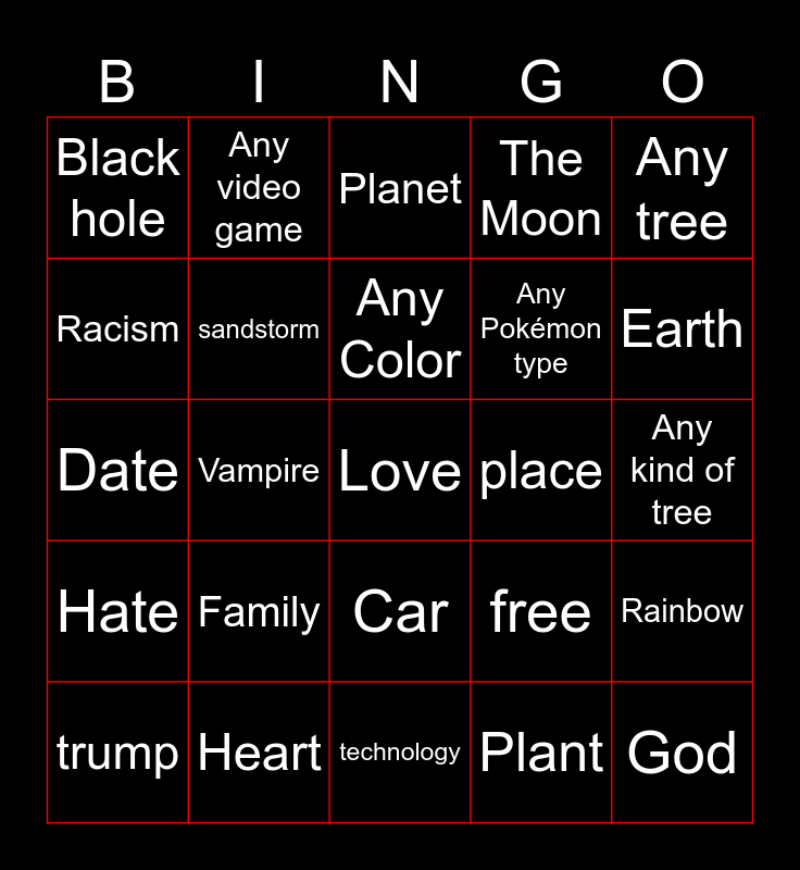 This bingo card has 25 words: Family, technology, Any Color, trump, Any tree, Black hole, Racism, Any video game, place, Car, Any Pokémon type, Date, free, Rainbow, sandstorm, God, Any kind of tree, Planet, Earth, Vampire, Love, Heart, Hate, The Moon and Plant.