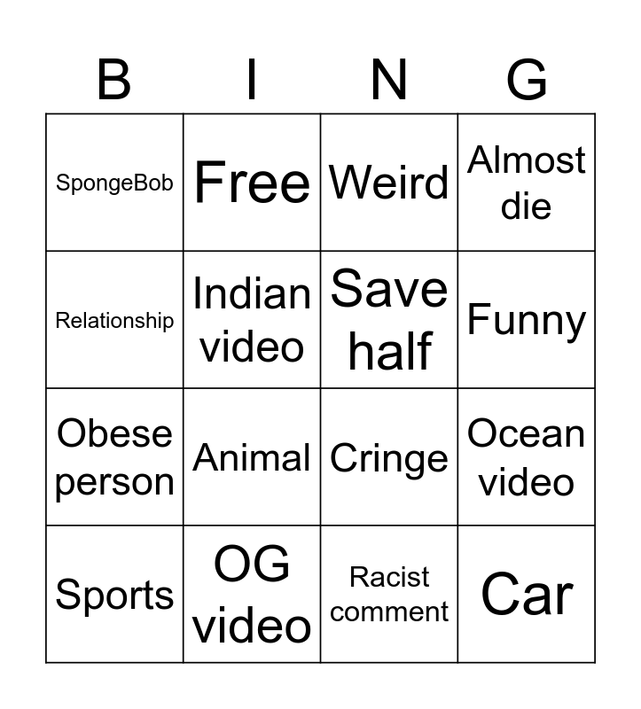 This bingo card has 16 words: OG video, Ocean video, Weird, SpongeBob, Obese person, Free, Cringe, Racist comment, Relationship, Indian video, Sports, Almost die, Animal, Funny, Save half and Car.
