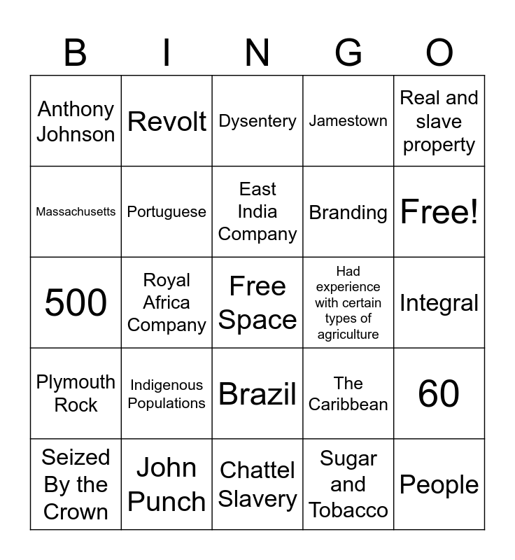 This bingo card has a free space and 24 words: Indigenous Populations, John Punch, East India Company, Seized By the Crown, Real and slave property, Anthony Johnson, Massachusetts, Revolt, Had experience with certain types of agriculture, Brazil, Branding, 500, The Caribbean, 60, Portuguese, Sugar and Tobacco, Integral, Dysentery, Free!, Royal Africa Company, People, Plymouth Rock, Jamestown and Chattel Slavery.