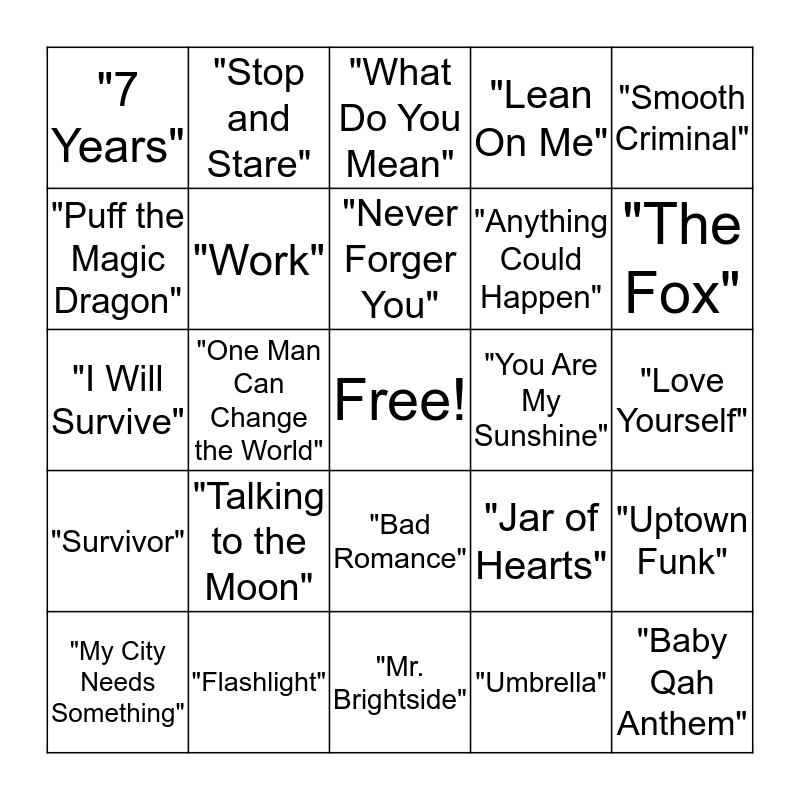 This bingo card has a free space and 24 words: "Talking to the Moon", "Flashlight", "Never Forger You", "My City Needs Something", "Smooth Criminal", "7 Years", "Puff the Magic Dragon", "Stop and Stare", "You Are My Sunshine", "Bad Romance", "Anything Could Happen", "I Will Survive", "Jar of Hearts", "Uptown Funk", "Work", "Umbrella", "Love Yourself", "What Do You Mean", "The Fox", "One Man Can Change the World", "Baby Qah Anthem", "Survivor", "Lean On Me" and "Mr. Brightside".