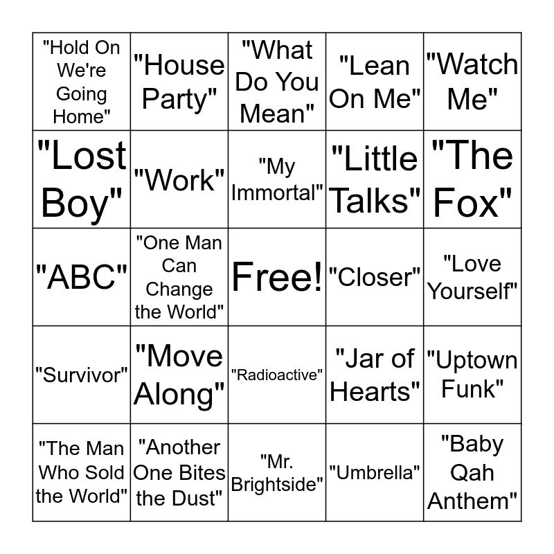 This bingo card has a free space and 24 words: "Move Along", "Another One Bites the Dust", "My Immortal", "The Man Who Sold the World", "Watch Me", "Hold On We're Going Home", "Lost Boy", "House Party", "Closer", "Radioactive", "Little Talks", "ABC", "Jar of Hearts", "Uptown Funk", "Work", "Umbrella", "Love Yourself", "What Do You Mean", "The Fox", "One Man Can Change the World", "Baby Qah Anthem", "Survivor", "Lean On Me" and "Mr. Brightside".