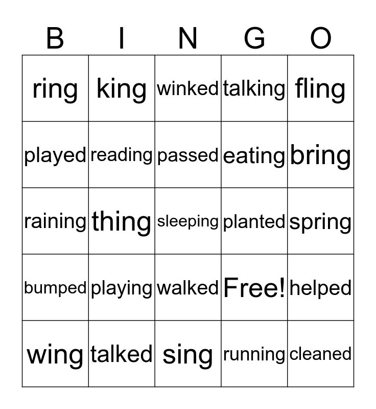 This bingo card has 25 words: playing, sing, passed, wing, fling, ring, played, king, planted, walked, eating, raining, Free!, helped, reading, cleaned, spring, winked, bring, thing, sleeping, talked, bumped, talking and running.