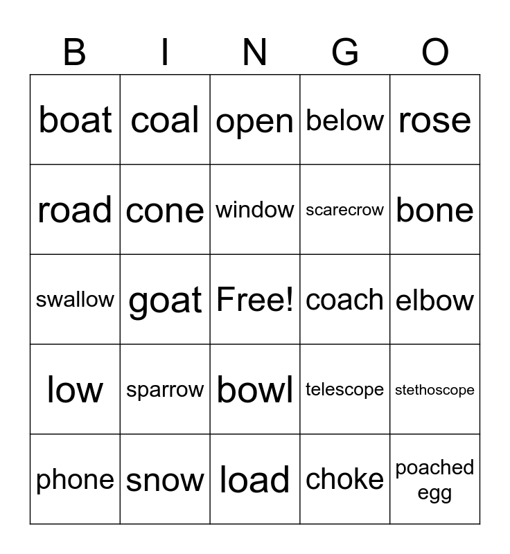 This bingo card has a free space and 24 words: sparrow, snow, window, phone, rose, boat, road, coal, coach, bowl, scarecrow, swallow, telescope, stethoscope, cone, choke, elbow, open, bone, goat, poached egg, low, below and load.