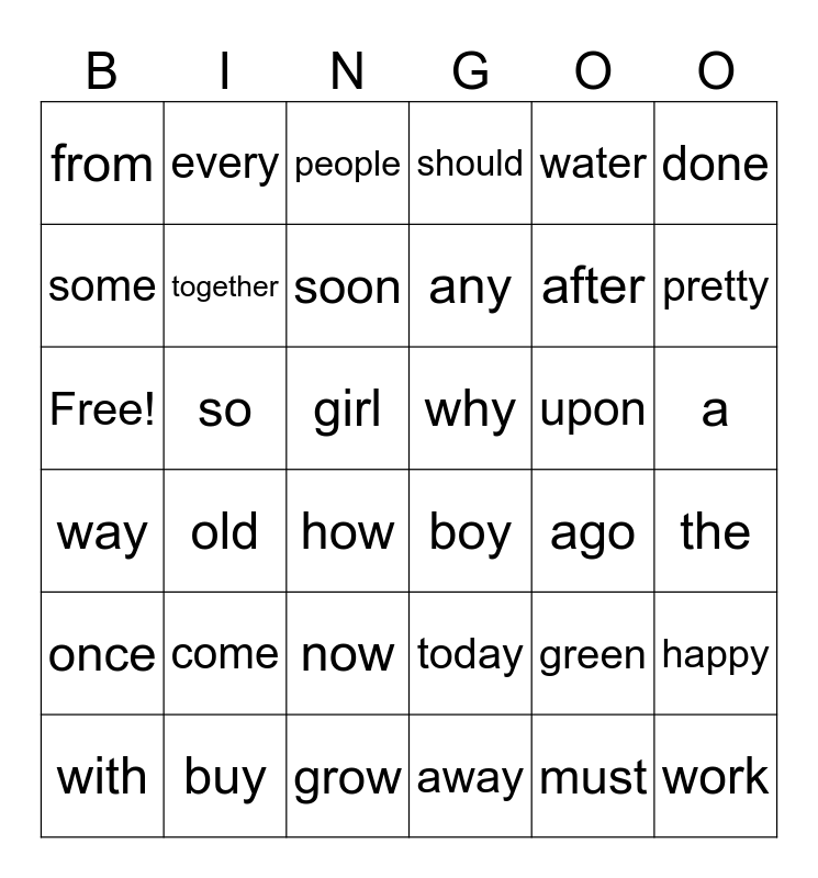 This bingo card has 36 words: today, now, away, some, way, why, together, grow, water, green, pretty, should, happy, so, any, from, once, upon, Free!, people, girl, old, boy, how, ago, every, after, buy, soon, done, work, with, the, a, come and must.