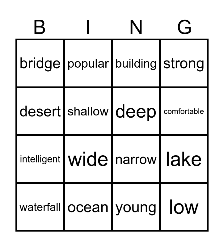 This bingo card has 20 words: lake, mountain, building, river, waterfall, desert, ocean, bridge, intelligent, popular, wide, narrow, shallow, low, deep, quite, comfortable, strong, young and smart.