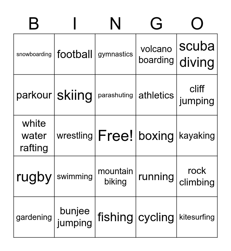 This bingo card has a free space and 24 words: swimming, bunjee jumping, parashuting, gardening, scuba diving, snowboarding, parkour, football, boxing, mountain biking, athletics, white water rafting, running, rock climbing, skiing, cycling, kayaking, gymnastics, cliff jumping, wrestling, kitesurfing, rugby, volcano boarding and fishing.