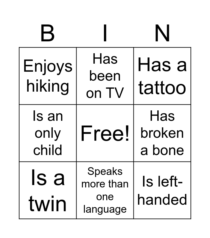 This bingo card has a free space and 11 words: Has a dog(s), Speaks more than one language, Is left-handed, Is a twin, Has been on TV, Has a tattoo, Has broken a bone, Rides a bicycle to work, Is an only child, Enjoys hiking and Doesn't drink coffee.