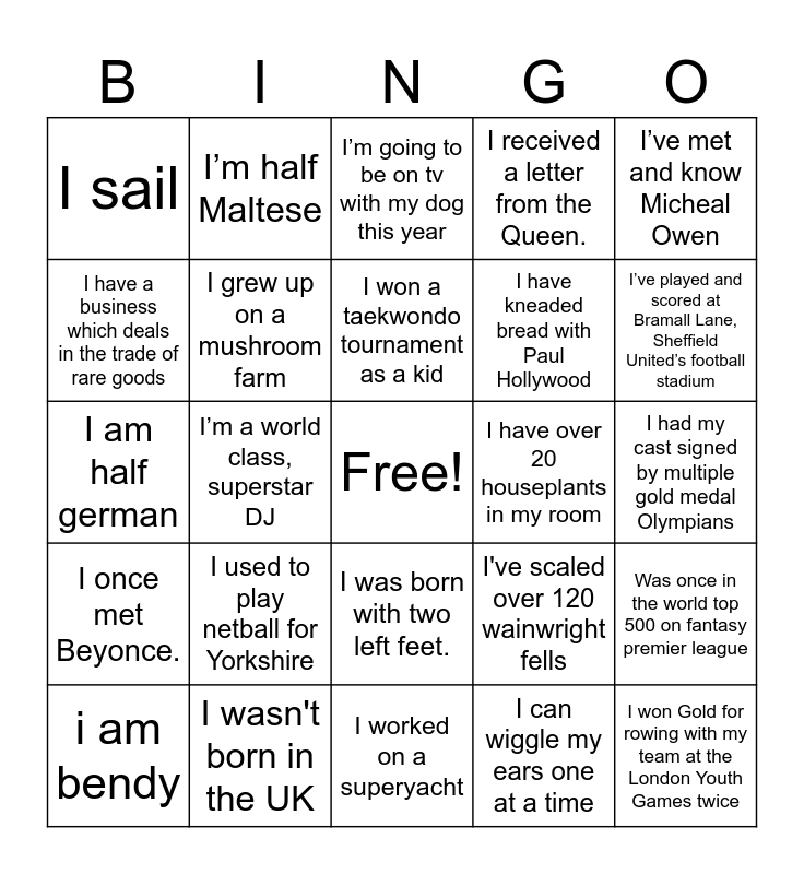 This bingo card has a free space and 74 words: I was an aunty when I was born, I know the NATO alphabet, I’m going to be on tv with my dog this year, I have a cat named after a footballer, I have never had a cup of tea, I have a pet chicken in another country, I can make 1cm long origami cranes, Tall middle aged woman looking for long term relationship. Eight cats, two ex-husbands and a talent for crystal divination, i am bendy, I was county 800m champion, I’ve been skydiving, I lived in Egypt, I won a taekwondo tournament as a kid, I have a business which deals in the trade of rare goods, I once met Jack Charlton on holiday, I’m a world class, superstar DJ, I got my first tattoo at 16., I’ve played and scored at Bramall Lane, Sheffield United’s football stadium, I used to be a musician, I am half german, I grew up on a mushroom farm, I’m half Maltese, I received a letter from the Queen., I went on the worlds fastest zip line., I won Gold for rowing with my team at the London Youth Games twice, I played young James May on an advert for Top Gear when I was a kid., I feature on an instagram account with over 70m followers., Jeremy Clarkson has bought me a drink, I worked for a year with an arms length body, I changed schools 9 times over primary and secondary, I’ve met and know Micheal Owen, I grew up in Pakistan., I’m descended from French aristocracy, I live in the same city as the SAS base (special forces), I'm still not sure if I'm ginger or not, I can wiggle my ears one at a time, I have a black belt in taekwondo, I've swam with Dolphins, I have migrated to 3 different countries, I lived in Kuwait, I worked on a superyacht, I wasn't born in the UK, I play Steel pans, I was born in New York., My favourite holiday was iceland, I sail, I was electrocuted as a baby., I used to play netball for Yorkshire, Grew up playing the violin, I've never broken any bones, I have over 100 family members in Ecuador, I crashed a scooter into a rickshaw, I had my cast signed by multiple gold medal Olympians, I have EDS (elders danlos syndrome). 0.005% of the population has it, I like chelsea, I managed a pub at 18, I was born with two left feet., I ran a candle business with friends during sixth form that won a sustainability award., I have a brother called Ant and I think I was named Dec on purpose, but I’ve am never asked., Was once in the world top 500 on fantasy premier league, I have kneaded bread with Paul Hollywood, Sometimes when I get bored I role around in my neighbour's garden and pretend to be a carrot., I once met Beyonce., i have 4 siblings, I have over 20 houseplants in my room, I've performed with English National Ballet, I have 7 siblings, I have type 1 diabetes, I've scaled over 120 wainwright fells, I was born & spent primary school in the highlands of Scotland, I was blind for 6 months, Ive got a metal collarbone, I have performed on a West End stage and I am a fanatical Notts County Supporter.