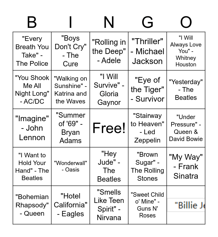This bingo card has 3 images, a free space and 40 words: "Bohemian Rhapsody" - Queen, "Billie Jean" - Michael Jackson, "Sweet Child o' Mine" - Guns N' Roses, "Rolling in the Deep" - Adele, "Livin' on a Prayer" - Bon Jovi, "I Will Always Love You" - Whitney Houston, "Hotel California" - Eagles, "Thriller" - Michael Jackson, "Stairway to Heaven" - Led Zeppelin, "Hey Jude" - The Beatles, "Wonderwall" - Oasis, "Like a Rolling Stone" - Bob Dylan, "Smells Like Teen Spirit" - Nirvana, "Let It Be" - The Beatles, "Imagine" - John Lennon, "Hallelujah" - Leonard Cohen, "Yesterday" - The Beatles, "Boys Don't Cry" - The Cure, "Don't Stop Believin'" - Journey, "Piano Man" - Billy Joel, "Every Breath You Take" - The Police, "Dancing Queen" - ABBA, "Under Pressure" - Queen & David Bowie, "Waterloo" - ABBA, "Brown Eyed Girl" - Van Morrison, "Brown Sugar" - The Rolling Stones, "I Want to Hold Your Hand" - The Beatles, "Sweet Caroline" - Neil Diamond, "My Way" - Frank Sinatra, "I Wanna Dance with Somebody" - Whitney Houston, "Summer of '69" - Bryan Adams, "I Heard It Through the Grapevine" - Marvin Gaye, "Dancing in the Dark" - Bruce Springsteen, "Born to Run" - Bruce Springsteen, "I Will Survive" - Gloria Gaynor, "You Shook Me All Night Long" - AC/DC, "Eye of the Tiger" - Survivor, "Don't You Want Me" - The Human League, "Walking on Sunshine" - Katrina and the Waves and "Total Eclipse of the Heart" - Bonnie Tyler.