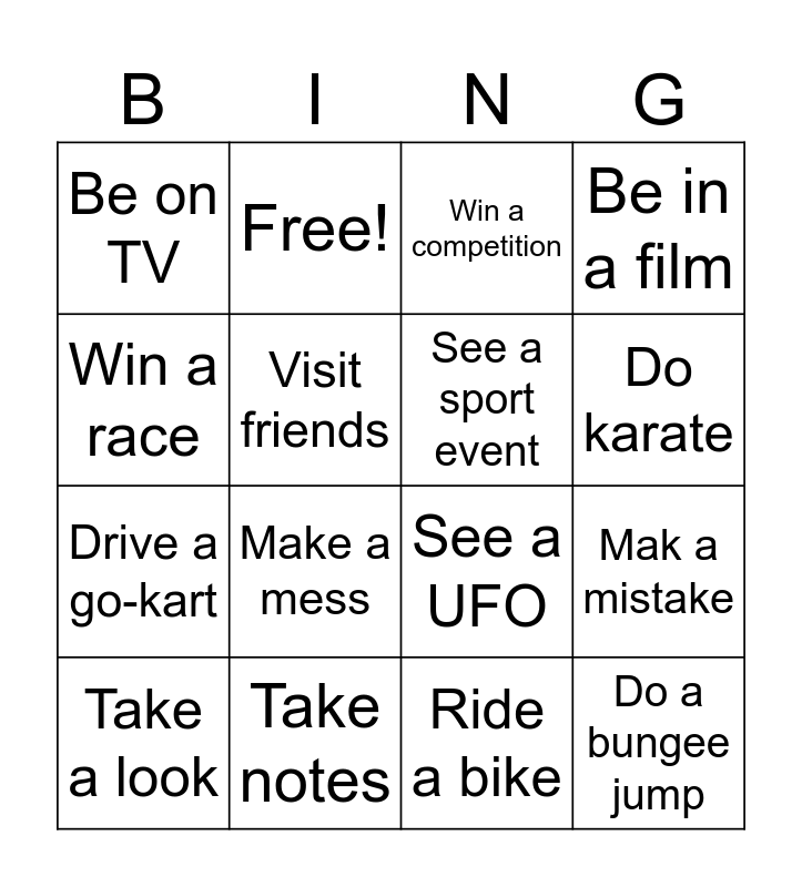 This bingo card has 19 words: See a UFO, Visit a place, Win a competition, Do a bungee jump, Mak a mistake, Win a race, Ride a bike, Be on TV, Free!, Drive a go-kart, Make a mess, Visit friends, See a sport event, Take notes, Take a look, Ride a horse, Be in a film, Do karate and Drive a racing car.