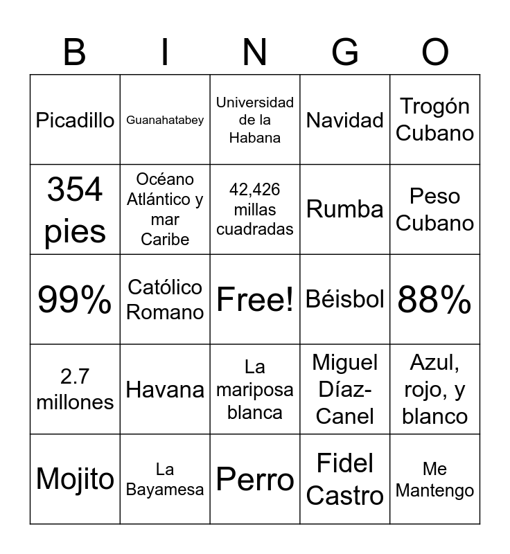 This bingo card has a free space and 24 words: Havana, La Bayamesa, 42,426 millas cuadradas, Mojito, Trogón Cubano, Picadillo, 354 pies, Guanahatabey, Béisbol, La mariposa blanca, Rumba, 99%, Miguel Díaz-Canel, Azul, rojo, y blanco, Océano Atlántico y mar Caribe, Fidel Castro, 88%, Universidad de la Habana, Peso Cubano, Católico Romano, Me Mantengo, 2.7 millones, Navidad and Perro.