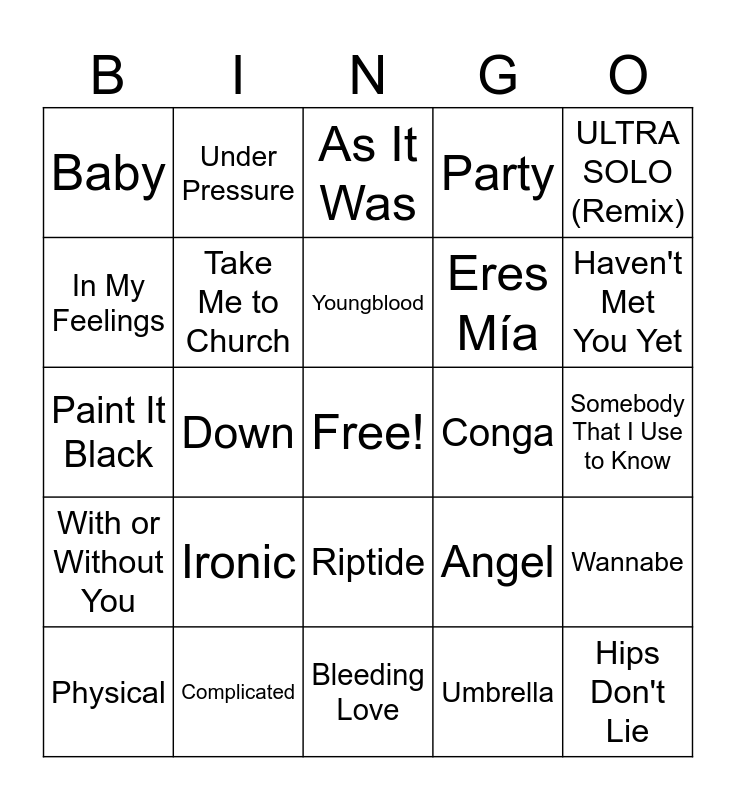 This bingo card has a free space and 24 words: Ironic, Complicated, Youngblood, Physical, ULTRA SOLO (Remix), Baby, In My Feelings, Under Pressure, Conga, Riptide, Eres Mía, Paint It Black, Angel, Wannabe, Take Me to Church, Umbrella, Somebody That I Use to Know, As It Was, Haven't Met You Yet, Down, Hips Don't Lie, With or Without You, Party and Bleeding Love.