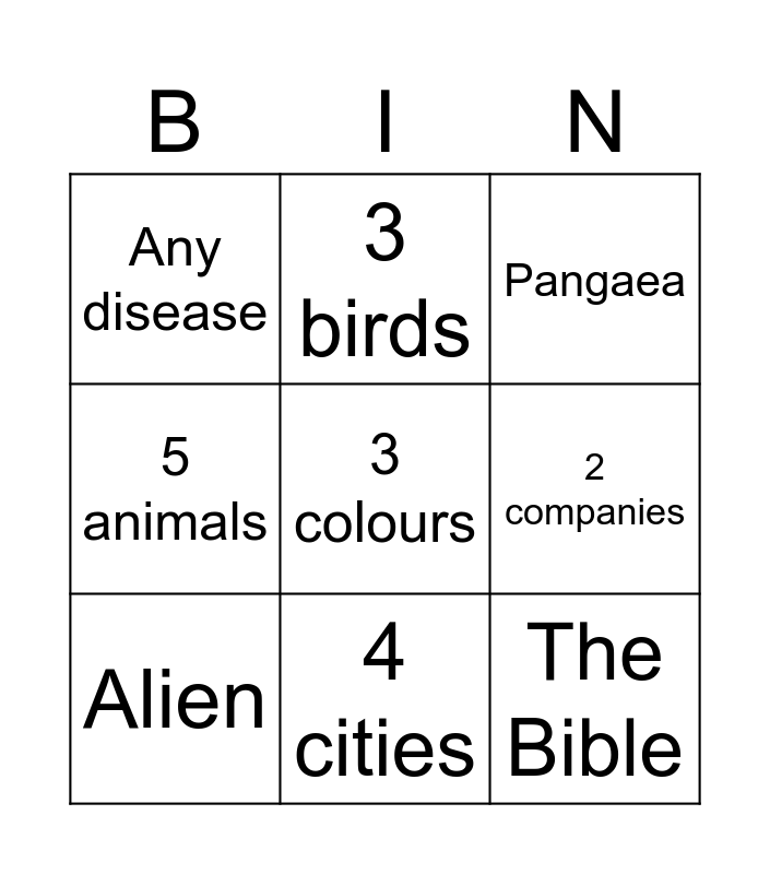 This bingo card has 9 words: Alien, Pangaea, 3 birds, 5 animals, Any disease, 2 companies, 3 colours, The Bible and 4 cities.