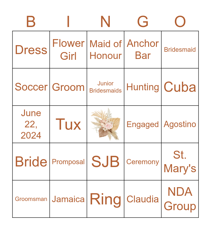 This bingo card has a free space and 34 words: Nick, Claudia, Reading, Heels, Bride, Groom, Bridesmaid, Groomsman, Flower Girl, Ring Bearer, Junior Bridesmaids, Maid of Honour, Best Man, Married, Engaged, Cuba, Jamaica, June 22, 2024, Promposal, Ceremony, SJB, Liuna Station, Dress, Agostino, Ring, NDA Group, Anchor Bar, I Do!, Hunting, Soccer, Shopping Addiction, Tux, St. Mary's and Nails.