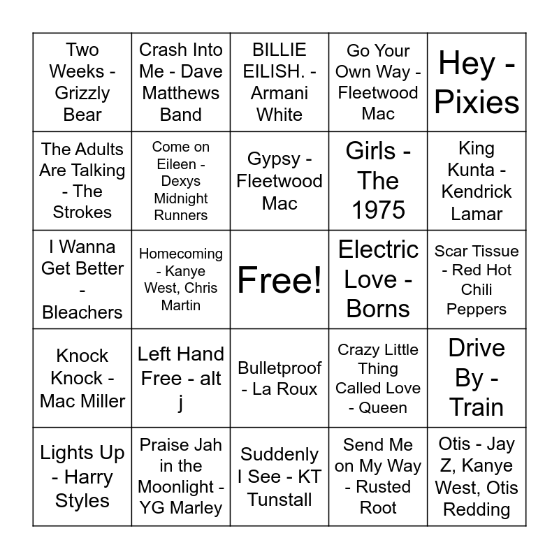 This bingo card has a free space and 24 words: Left Hand Free - alt j, Praise Jah in the Moonlight - YG Marley, Gypsy - Fleetwood Mac, Lights Up - Harry Styles, Hey - Pixies, Two Weeks - Grizzly Bear, The Adults Are Talking - The Strokes, Crash Into Me - Dave Matthews Band, Electric Love - Borns, Bulletproof - La Roux, Girls - The 1975, I Wanna Get Better - Bleachers, Crazy Little Thing Called Love - Queen, Drive By - Train, Come on Eileen - Dexys Midnight Runners, Send Me on My Way - Rusted Root, Scar Tissue - Red Hot Chili Peppers, BILLIE EILISH. - Armani White, King Kunta - Kendrick Lamar, Homecoming - Kanye West, Chris Martin, Otis - Jay Z, Kanye West, Otis Redding, Knock Knock - Mac Miller, Go Your Own Way - Fleetwood Mac and Suddenly I See - KT Tunstall.