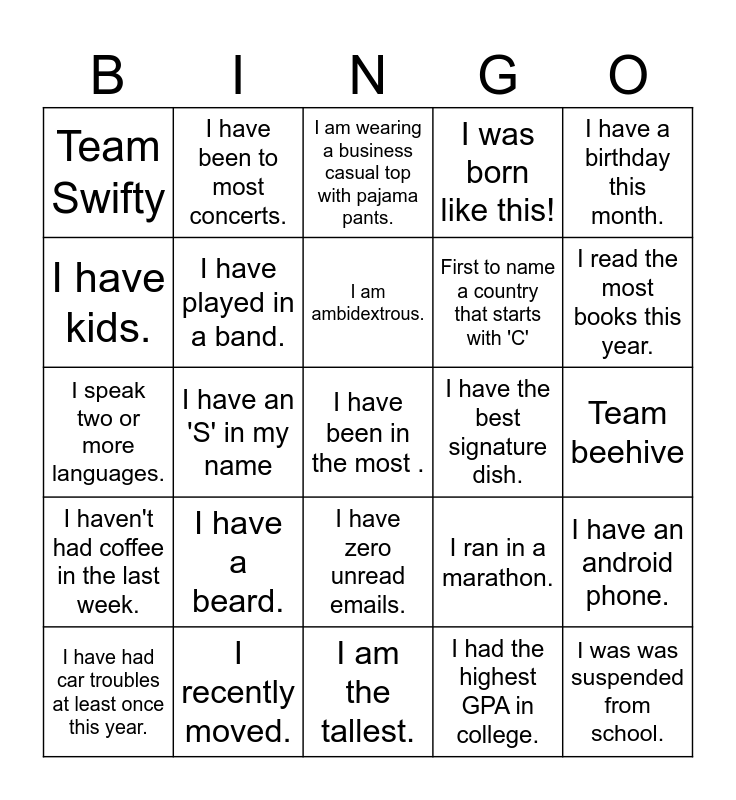 This bingo card has a free space and 34 words: I have the most pets., I had the highest GPA in college., I have traveled to the most countries., I have the most siblings., I haven't had coffee in the last week., I have played in a band., I have a birthday this month., I have had car troubles at least once this year., I have been to most concerts., I have never been on a plane., I am ambidextrous., I am wearing a business casual top with pajama pants., 5!=?, I am a high school athlete., I have the best signature dish., I read the most books this year., I recently moved., I speak two or more languages., I have a beard., I ran in a marathon., I have zero unread emails., I spent valentines day alone., Team Swifty, Team beehive, I am the tallest., I was was suspended from school., I was born like this!, I am afraid of clowns., First to name a country that starts with 'C', I have kids., I have eaten the weirdest food., I have an 'S' in my name, I have an android phone. and I am vegan..