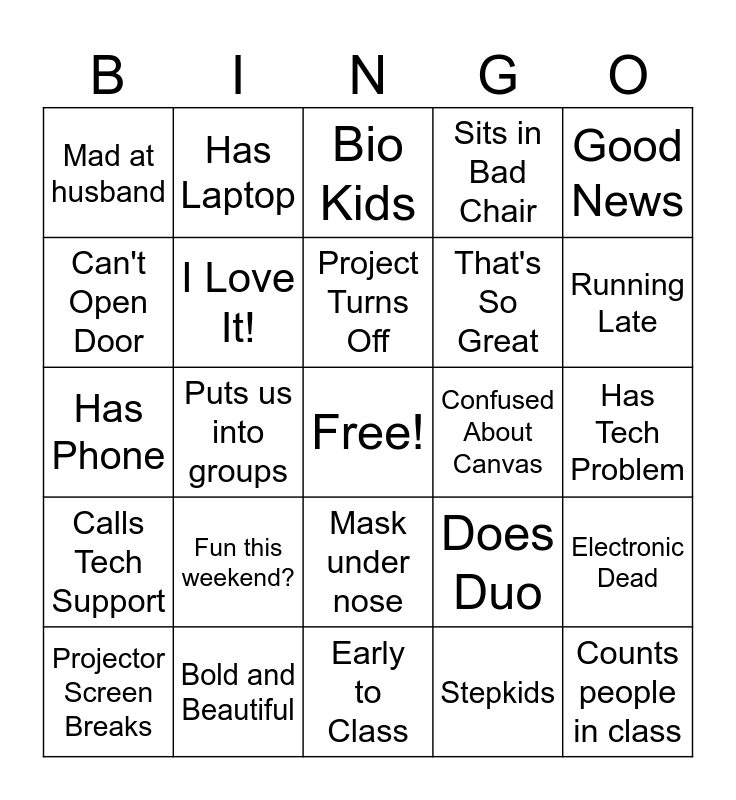 This bingo card has a free space and 24 words: Fun this weekend?, Bold and Beautiful, Project Turns Off, Projector Screen Breaks, Good News, Mad at husband, Can't Open Door, Has Laptop, Confused About Canvas, Mask under nose, That's So Great, Has Phone, Does Duo, Electronic Dead, I Love It!, Stepkids, Has Tech Problem, Bio Kids, Running Late, Puts us into groups, Counts people in class, Calls Tech Support, Sits in Bad Chair and Early to Class.