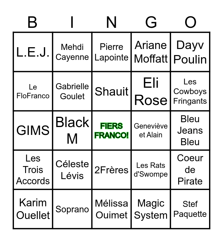 This bingo card has a free space and 49 words: Damien Robitaille, Stef Paquette, Roxane Bruneau, Mélissa Ouimet, Céleste Lévis, Joly, Mehdi Cayenne, Yao, Le FloFranco, DJ Unpier, Gabrielle Goulet, Ariane Moffatt, Coeur de Pirate, Les Rats d'Swompe, Kimya, Mimi O'Bonsawin, Shauit, Geneviève et Alain, Super Plage, Dayv Poulin, Black M, Magic System, L.E.J., Eli Rose, Claude Bégin, Les Cowboys Fringants, Karim Ouellet, Sarahmée, 2Frères, Les Trois Accords, LGS, Louane, Brian St-Pierre, Sympa César, Soprano, Suzane, Stromae, Corneille, Bleu Jeans Bleu, Kids United, Bigflo & Oli, Angèle, Collectif Métissé, Marie-Mai, GIMS, Pierre Lapointe, Qualité Motel, Marie-Clo and KNLO.