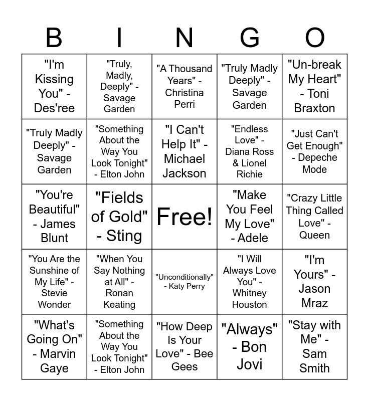 ⚠ This card has duplicate items: "I Just Called to Say I Love You" - Stevie Wonder (2), "Love Me Like You Do" - Ellie Goulding (2), "I Will Follow You into the Dark" - Death Cab for Cutie (2), "Amazed" - Lonestar (2), "Bleeding Love" - Leona Lewis (2), "Always" - Bon Jovi (2), "Truly Madly Deeply" - Savage Garden (2), "Vision of Love" - Mariah Carey (2), "Eternal Flame" - The Bangles (2), "Your Song" - Elton John (2), "Make You Feel My Love" - Adele (2), "Just Give Me a Reason" - P!nk ft. Nate Ruess (2), "Nothing Compares 2 U" - Sinéad O'Connor (2), "I Want to Know What Love Is" - Foreigner (2), "At Last" - Etta James (2), "Kiss Me" - Sixpence None the Richer (2), "Unconditionally" - Katy Perry (2), "Truly" - Lionel Richie (2), "Lovely Day" - Bill Withers (2), "I'm Yours" - Jason Mraz (2), "What's Going On" - Marvin Gaye (2), "A Thousand Years" - Christina Perri (2), "Can't Help Falling in Love" - Elvis Presley (2), "L-O-V-E" - Nat King Cole (2), "I Say a Little Prayer" - Aretha Franklin (2), "You Are the Sunshine of My Life" - Stevie Wonder (2), "Something About the Way You Look Tonight" - Elton John (2), "You're Beautiful" - James Blunt (2), "Just Like Heaven" - The Cure (2), "Crazy Little Thing Called Love" - Queen (2), "Just Can't Get Enough" - Depeche Mode (2), "I Can't Help It" - Michael Jackson (2), "Fields of Gold" - Sting (2), "Love Story" - Taylor Swift (2), "Stay with Me" - Sam Smith (2), "When You Say Nothing at All" - Ronan Keating (2), "I'm Kissing You" - Des'ree (2), "Can't Take My Eyes Off You" - Frankie Valli (2), "The Power of Love" - Celine Dion (2), "Let's Stay Together" - Al Green (2), "Truly, Madly, Deeply" - Savage Garden (2), "Something" - The Beatles (2), "I Don't Want to Miss a Thing" - Aerosmith (2), "Un-break My Heart" - Toni Braxton (2)