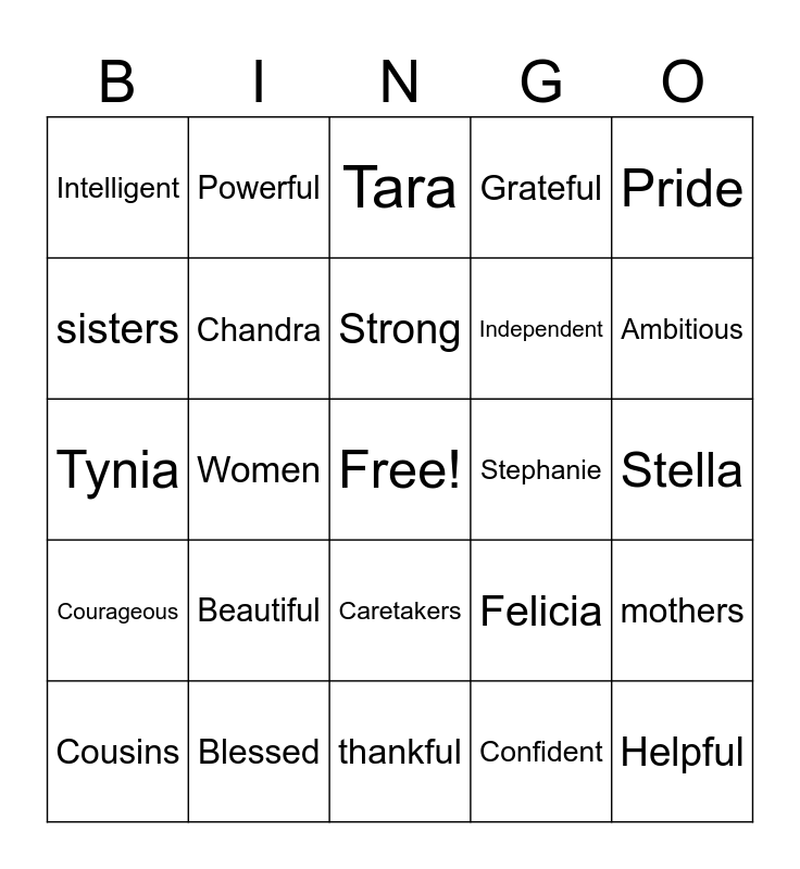 This bingo card has a free space and 24 words: Cousins, Beautiful, Strong, Confident, Pride, Intelligent, Powerful, Tara, Stephanie, Stella, Tynia, Chandra, Felicia, mothers, sisters, Blessed, thankful, Grateful, Ambitious, Courageous, Women, Caretakers, Independent and Helpful.