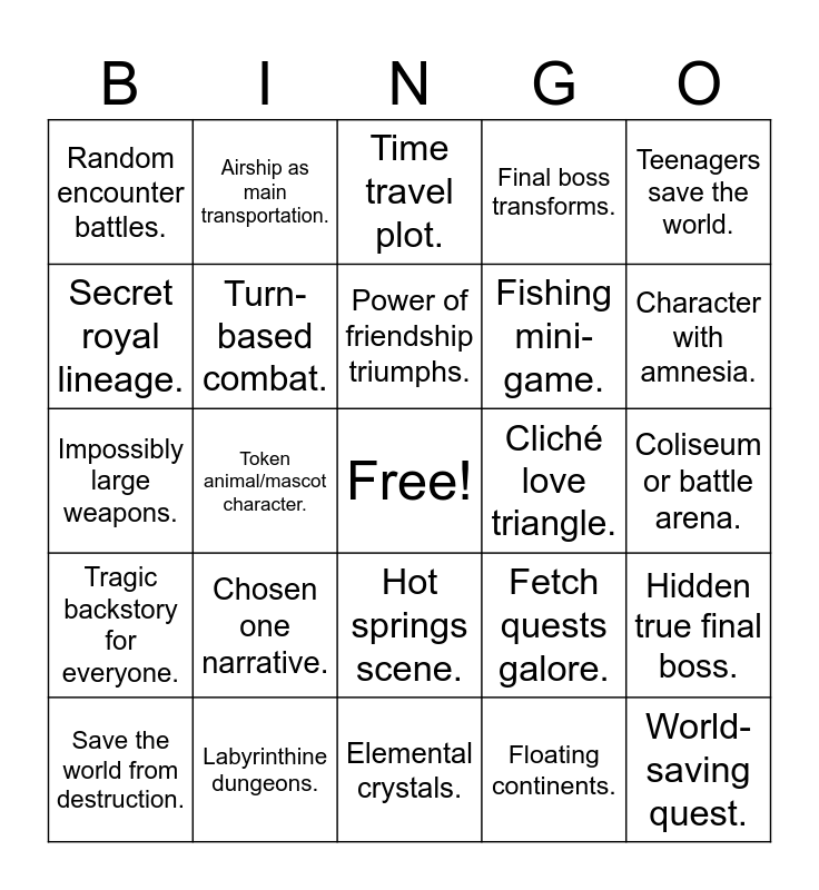 This bingo card has a free space and 50 words: Amnesiac protagonist., World-saving quest., Ancient evil reawakens., Elemental crystals., Chosen one narrative., Silent protagonist., Airship as main transportation., Mysterious girl with powers., Secret royal lineage., Villain turns good., Turn-based combat., Final boss transforms., Hidden true final boss., Fetch quests galore., Party member betrayal., Lost civilization., Power of friendship triumphs., Cliché love triangle., Summoned creatures., Teenagers save the world., Token animal/mascot character., Floating continents., Random encounter battles., Fishing mini-game., Cooking/eating for buffs., Legendary sword or weapon., Character with amnesia., Overworld map travel., Time travel plot., Hot springs scene., Cursed characters., Evil empire., One-dimensional villain., Grinding for experience., Labyrinthine dungeons., Characters join temporarily., Overly complex plot., Orphan protagonist., Magic versus technology theme., Coliseum or battle arena., Collectible monster companions., Unwinnable boss fights., Dystopian future., Elemental weaknesses., Save the world from destruction., Impossibly large weapons., Long-lost siblings., Sudden but inevitable betrayal., Tragic backstory for everyone. and Inexplicably powerful final move..