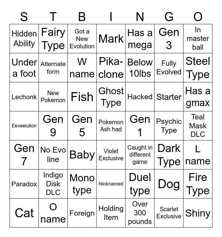 This bingo card has 49 words: Paradox, New Pokemon, Mono type, Violet Exclusive, Hacked, Psychic Type, In master ball, Cat, Alternate form, Gen 5, Pika-clone, Has a mega, Fully Evolved, Has a gmax, Gen 7, No Evo line, Got a New Evolution, Ghost Type, Over 300 pounds, Gen 3, Steel Type, Under a foot, Fairy Type, W name, Holding Item, Below 10lbs, Starter, Fire Type, Hidden Ability, Gen 9, Foreign, Nicknamed, Caught in different game, Dog, Teal Mask DLC, Eeveelution, Indigo Disk DLC, Baby, Pokemon Ash had, Gen 1, Scarlet Exclusive, L name, Lechonk, O name, Fish, Mark, Duel type, Dark Type and Shiny.